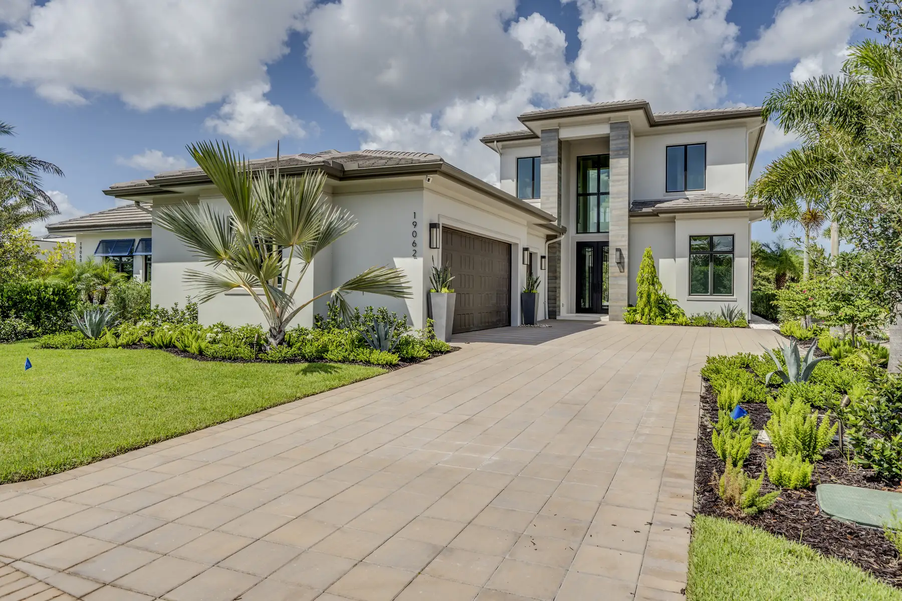 - Designer accents and ornamental shutters complement the modern stucco façade.